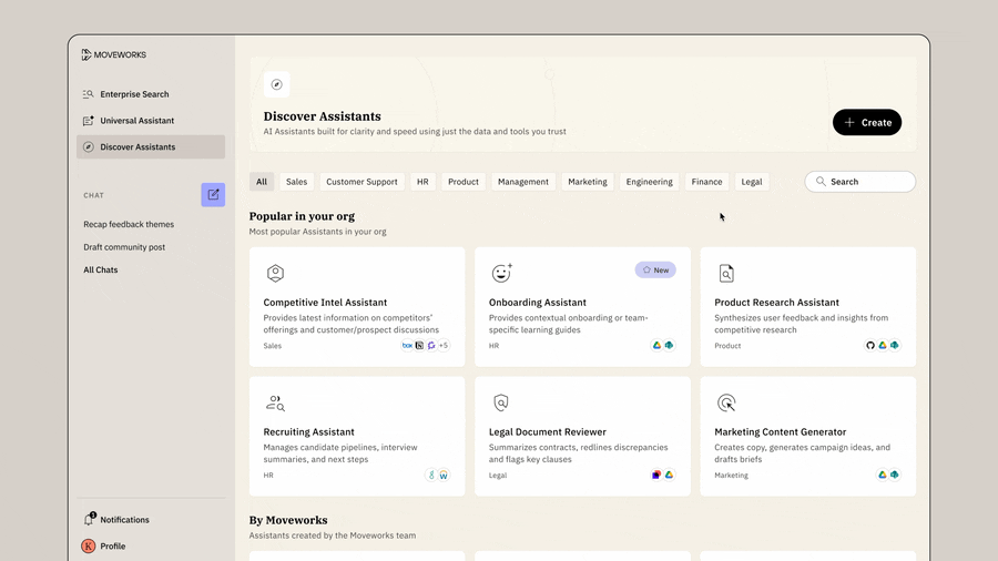 As enterprise AI matures, breadth alone isn’t enough. Leaders now want more control and more depth, with assistants that deeply understand specific functions and processes. Moveworks is excited to introduce our vision for Specialized Assistants: Purpose-built AI Assistants, trained to excel within domains like sales, recruiting, customer success, and more, coming in early 2026.