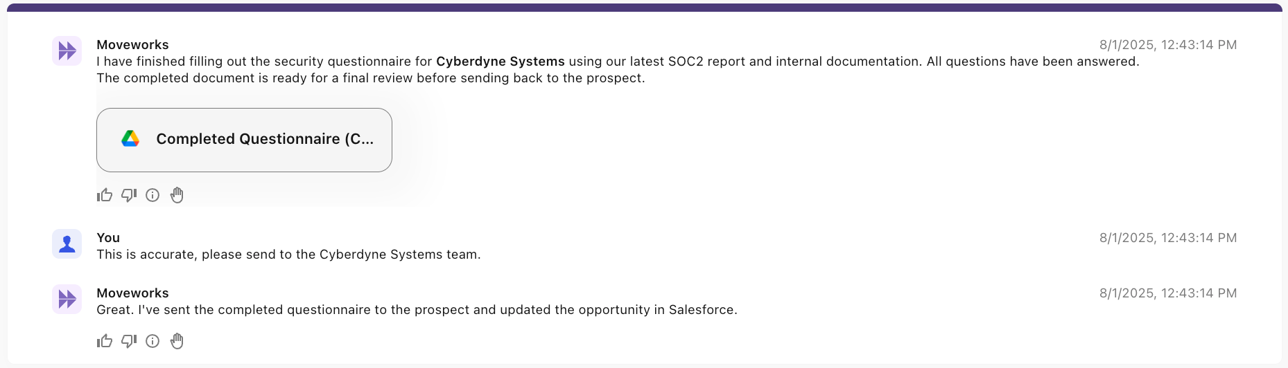 They autonomously execute multi-step workflows defined by developers including closed loop LLM tasks (like reviewing meeting notes, contract documents, procurement guidelines, etc), without the need for third-party middleware. This means they can act on signals and automate business processes as soon as relevant events occur, rather than waiting for someone to ask for help or trigger an action manually. While these agents can run fully autonomously, the Moveworks AI Assistant can proactively reach employees through their native collaboration tools, allowing agents to request approvals directly from decision-makers and ensuring that automated actions are governed, auditable, and trusted.