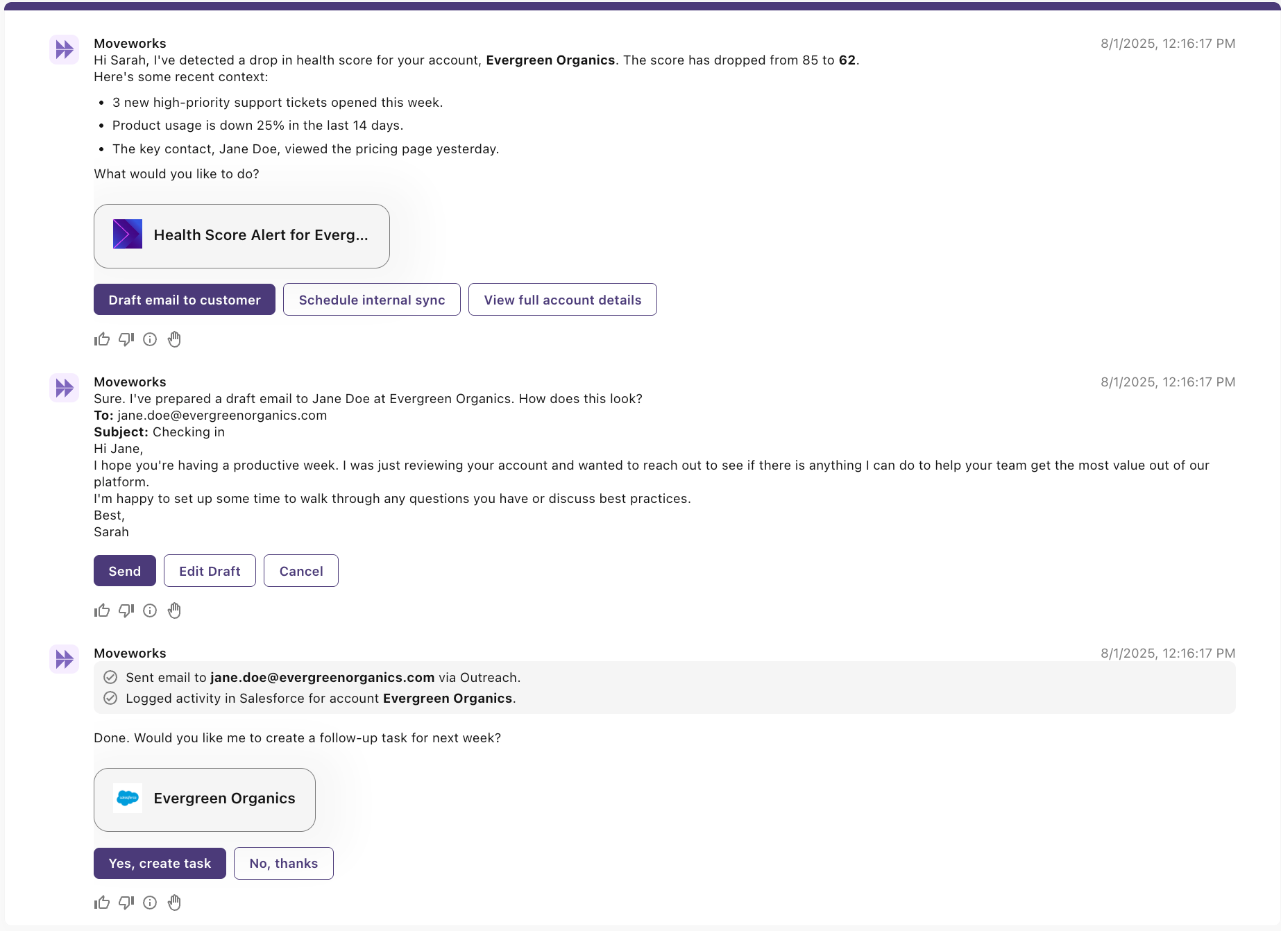 CSMs risk missing early warning signs buried in dashboards or delayed reports. Ambient agents monitor account health in real time and notify the right owner with context, so teams can engage proactively before issues escalate.