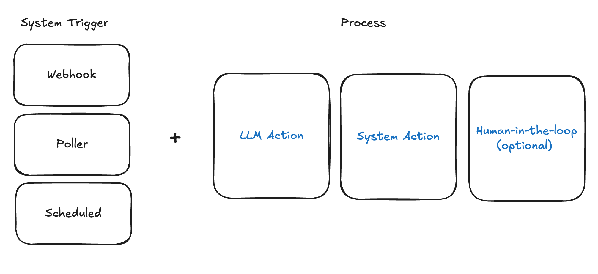 If system triggers are the eyes and ears, then the Process is the brain and hands, interpreting signals and determining the path forward. Once triggered, the Ambient agent will evaluate what needs to happen to execute workflows from start to finish. The Ambient agent may choose to: