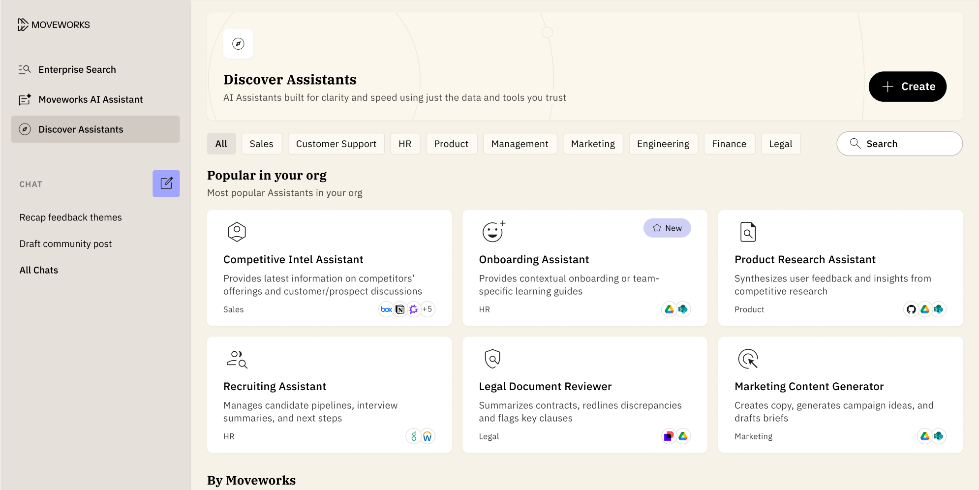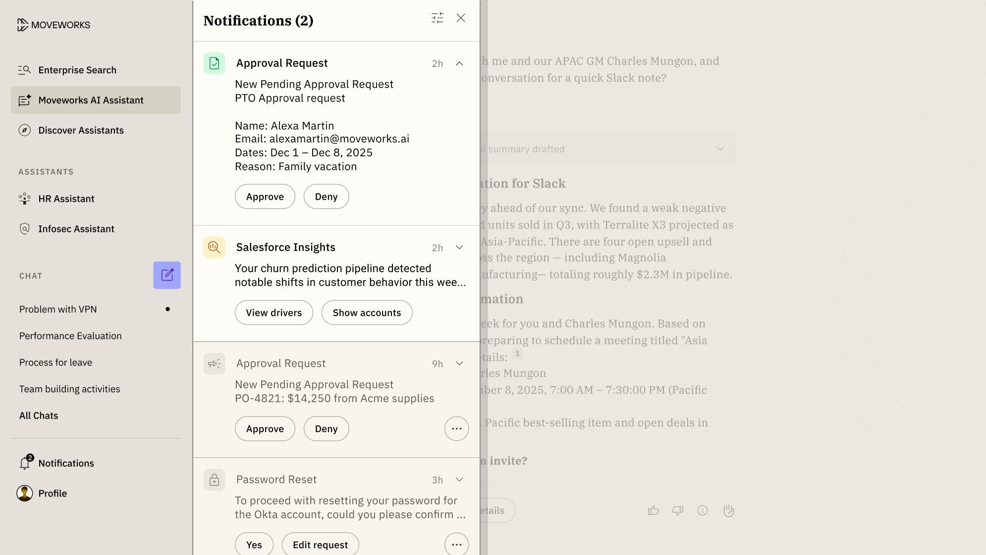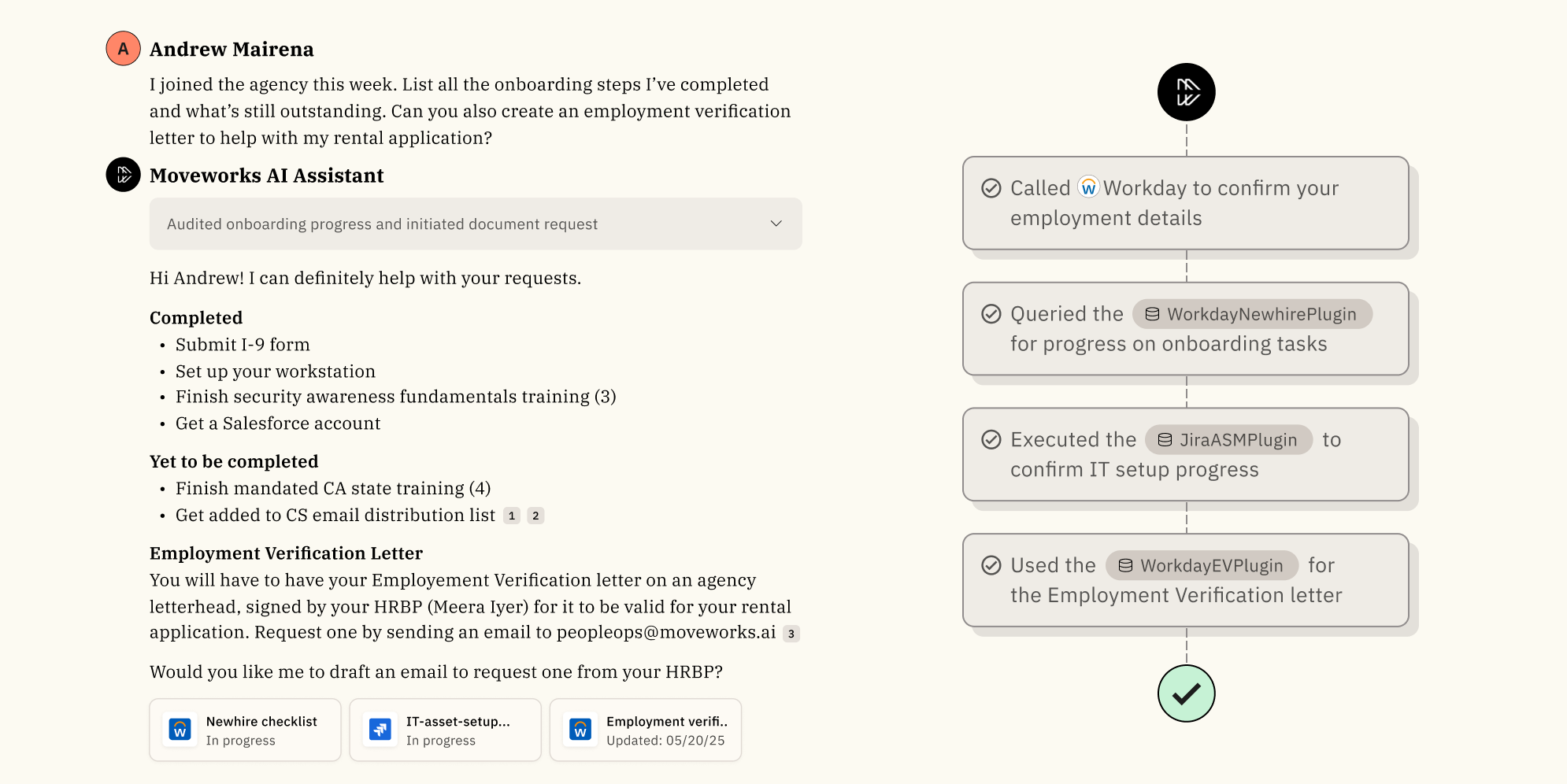 Moveworks AI Assistant personalizes responses with business context and individual permissions, routing requests to the right applications and learning continuously from each interaction. It’s powered by a sophisticated Reasoning Engine that understands intent, nuance, and your organization’s unique workflows to accelerate execution for your entire workforce.