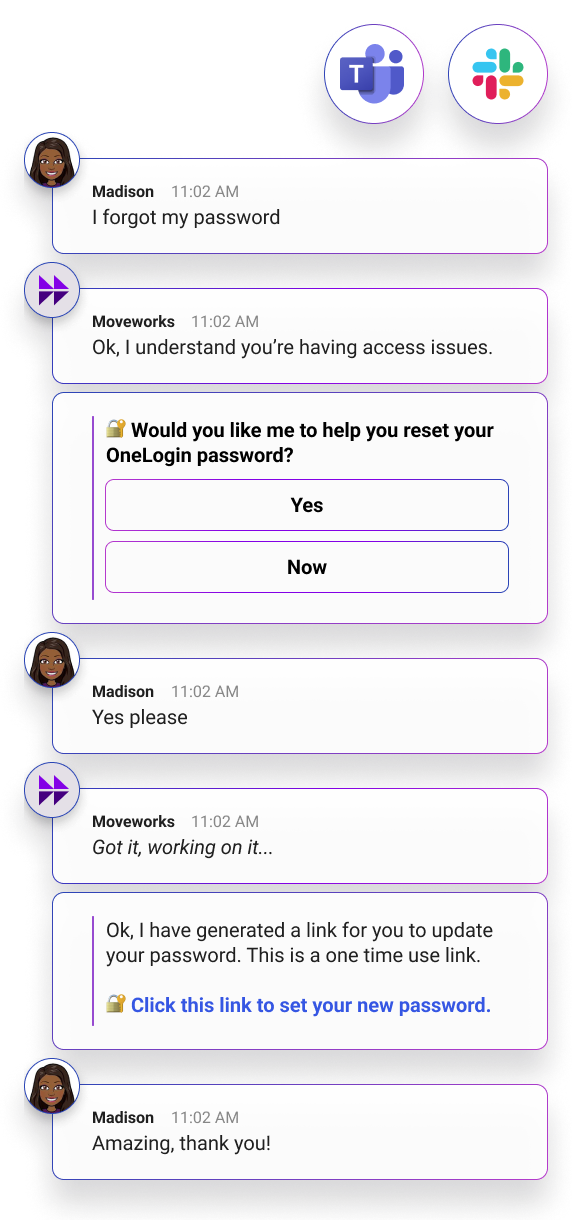 Your enterprise copilot integrates with every business system, meaning it can support any use case across any department. Whether your employee needs help resetting a password, requesting PTO, or submitting an expense — they can do it all in chat.