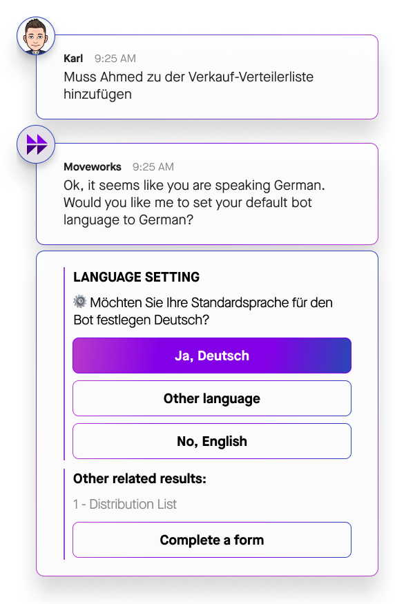 Powered by Moveworks’ enterprise copilot platform, your copilot is fluent in over 100 languages on day one. Your copilot can switch between languages and determine the ideal response on the fly. That way, you can ensure every employee gets the same level of support, no matter what language they speak.