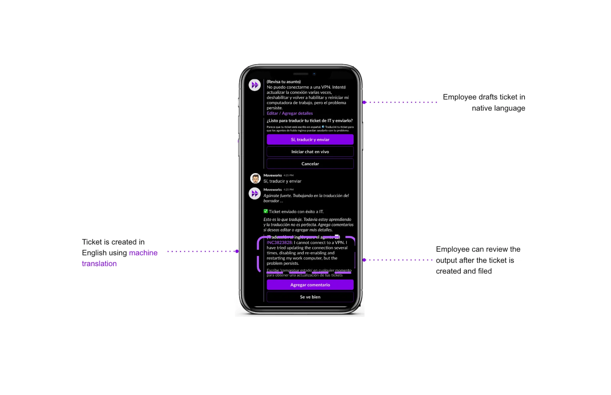If the issue ends up requiring escalation, the system can translate the important details for the U.S.-based IT team, while maintaining communication with the employee in Portuguese.