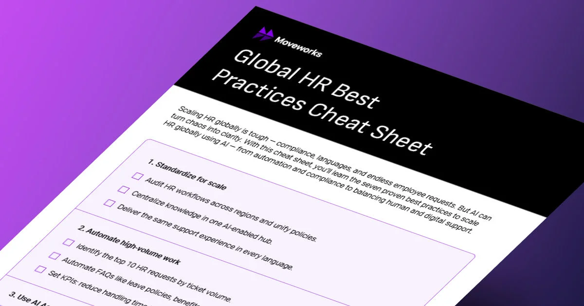 This cheat sheet outlines seven proven best practices to help you scale HR globally with AI. From automating repetitive tasks to ensuring compliance everywhere, you’ll learn how to strike the right balance between human and digital support — while creating a consistent experience for every employee, everywhere.