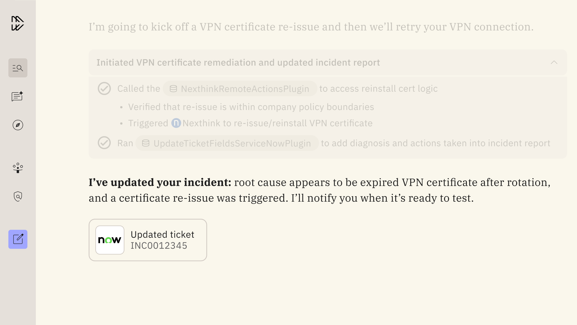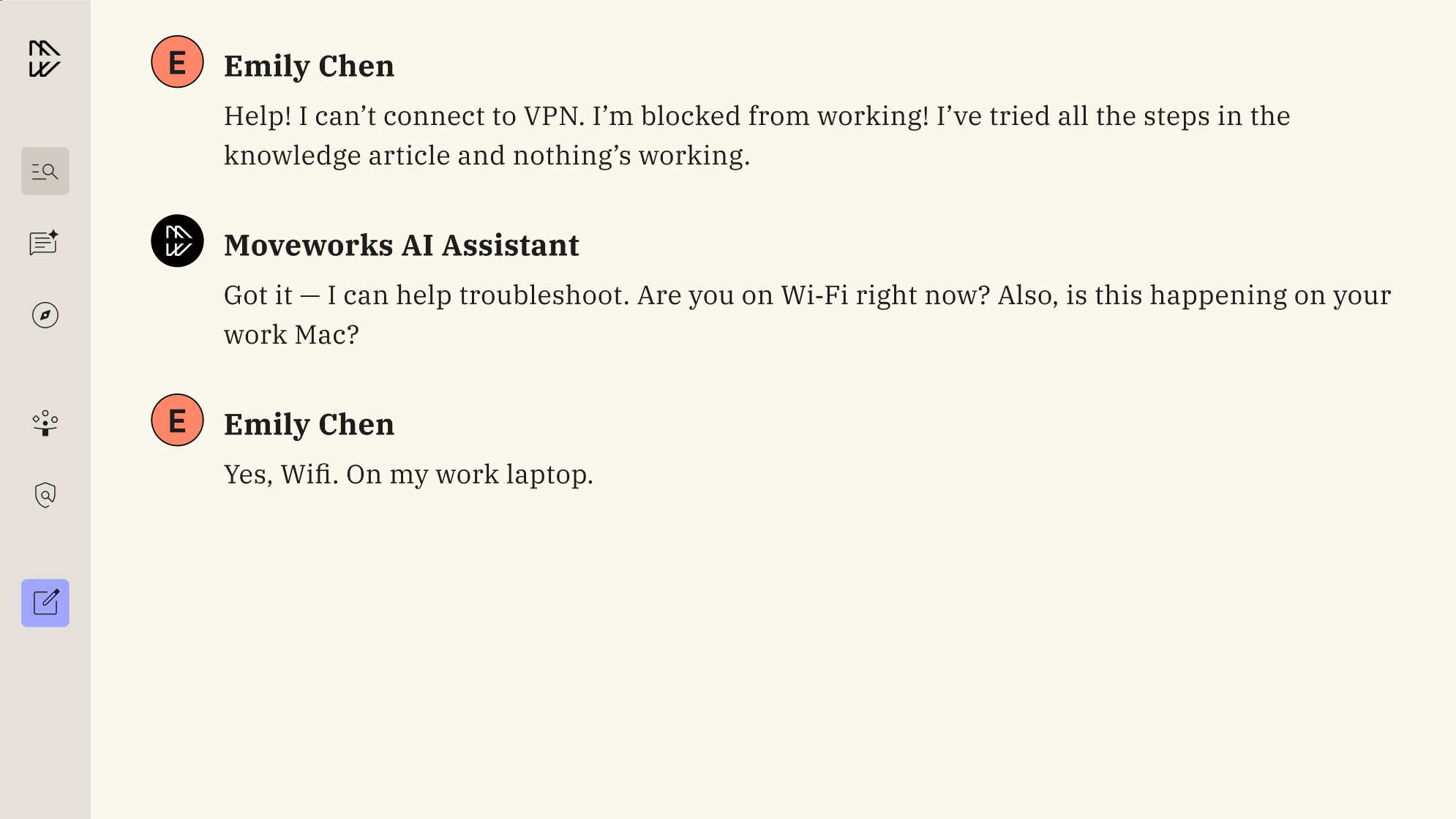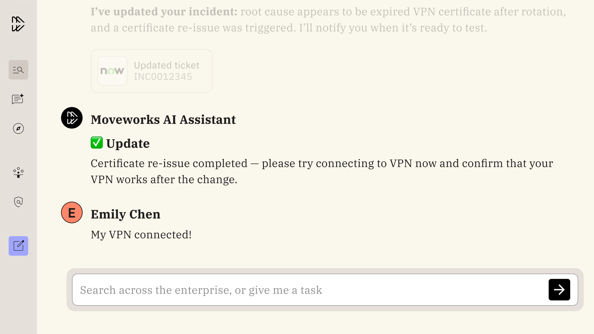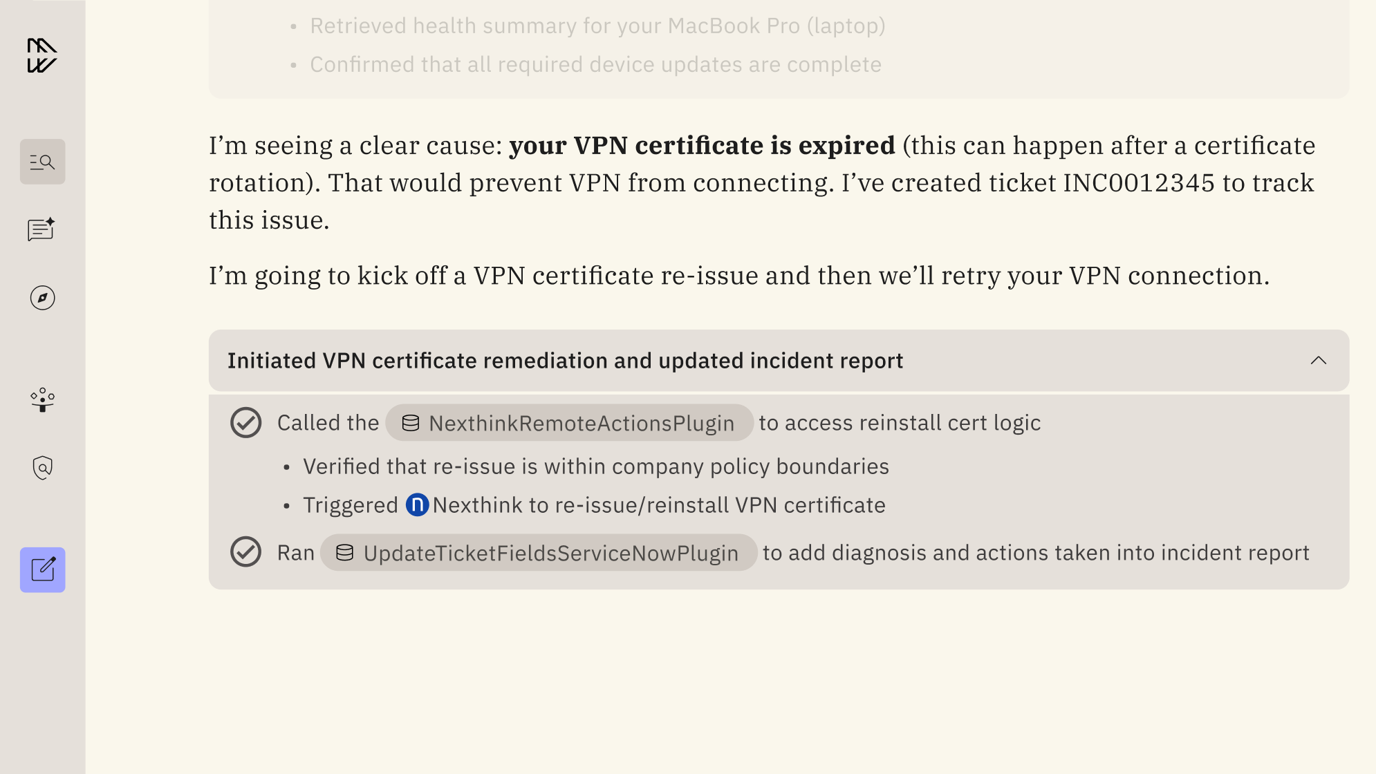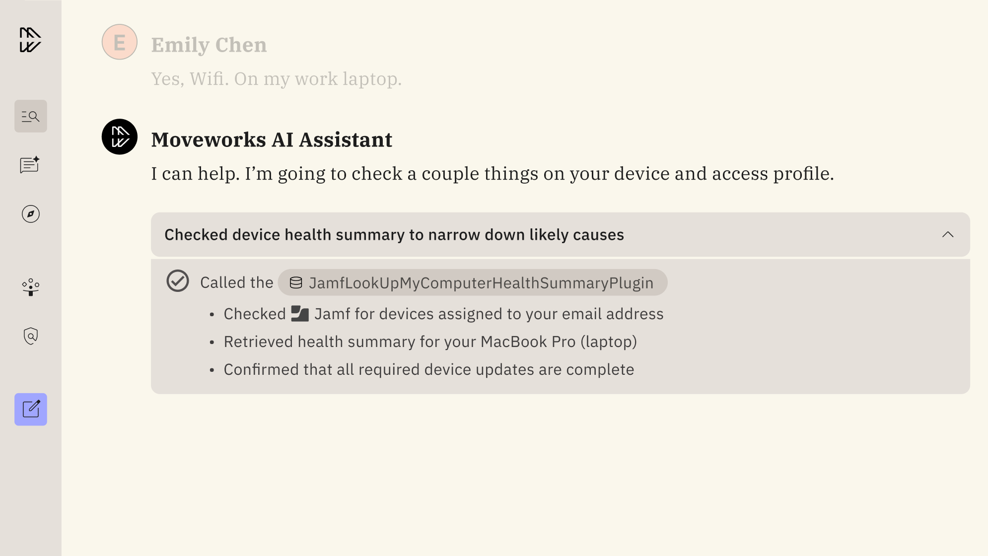 While legacy tools often cannot take action or work well outside of one ecosystem of apps, Moveworks leverages a highly sophisticated Reasoning Engine to understand nuanced intent, plan multi-step resolutions, and act autonomously across all your systems. When an employee relays, “My laptop won’t connect to VPN,” it doesn’t just surface a “how-to” article or stop at suggestions, it actually acts to resolve each particular issue by: