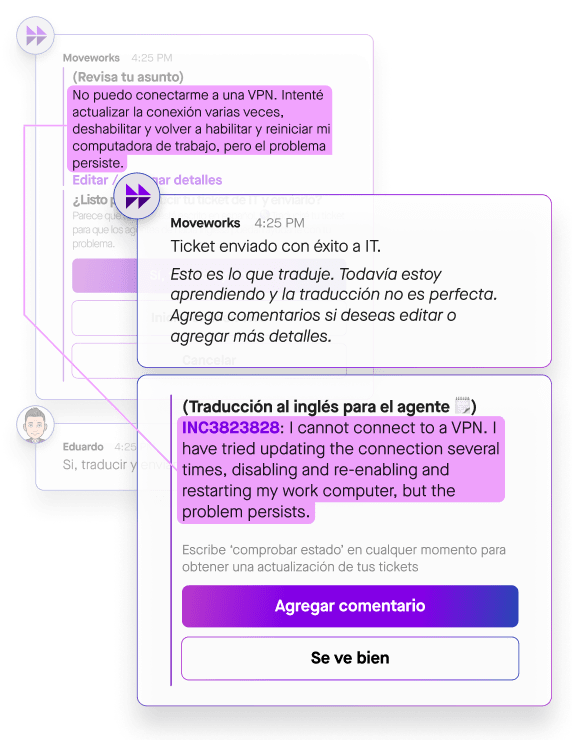 Employees can file tickets in any language of their choice. Our platform automatically translates their ticket so any agent can quickly understand the issue. Once the issue is resolved, Moveworks translates the entire ticket back to English to ensure system compliance.