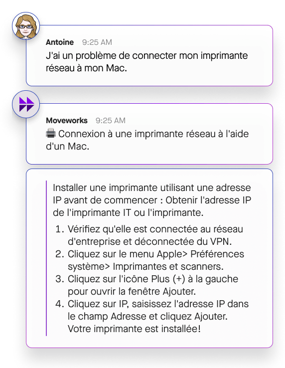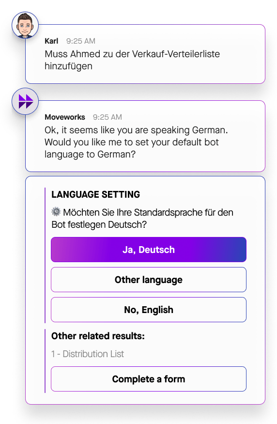 Moveworks is designed to engage employees on their terms, without following a script. Our platform can switch languages and determine the ideal response on the fly — using machine learning models fine-tuned on domain-specific language.